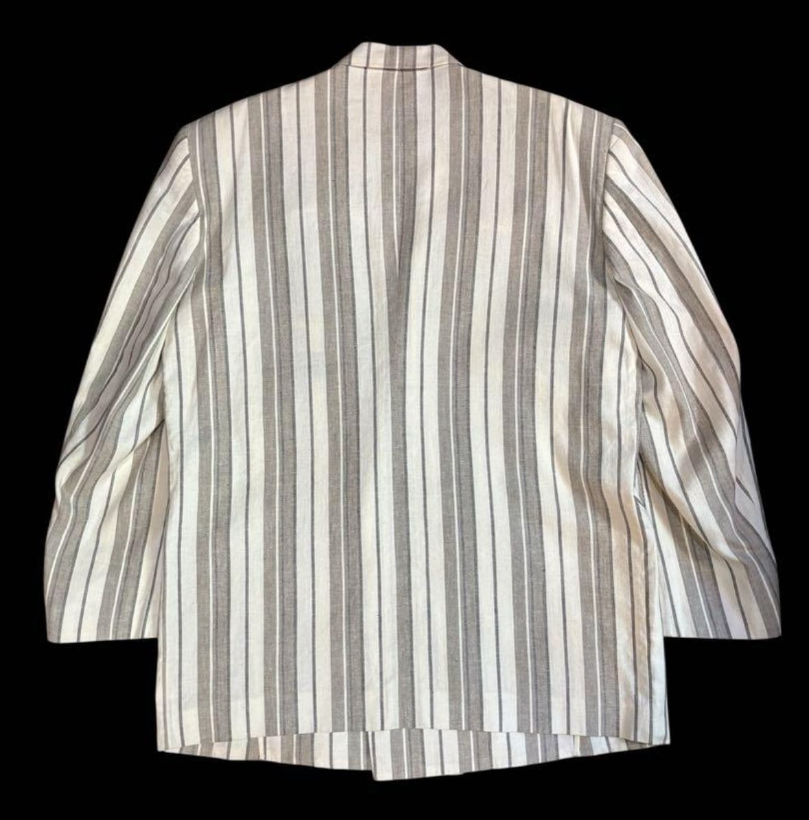 ホワイトベースにライトグレーのストライプの走るモードなダブルのテーラードジャケットとなります。