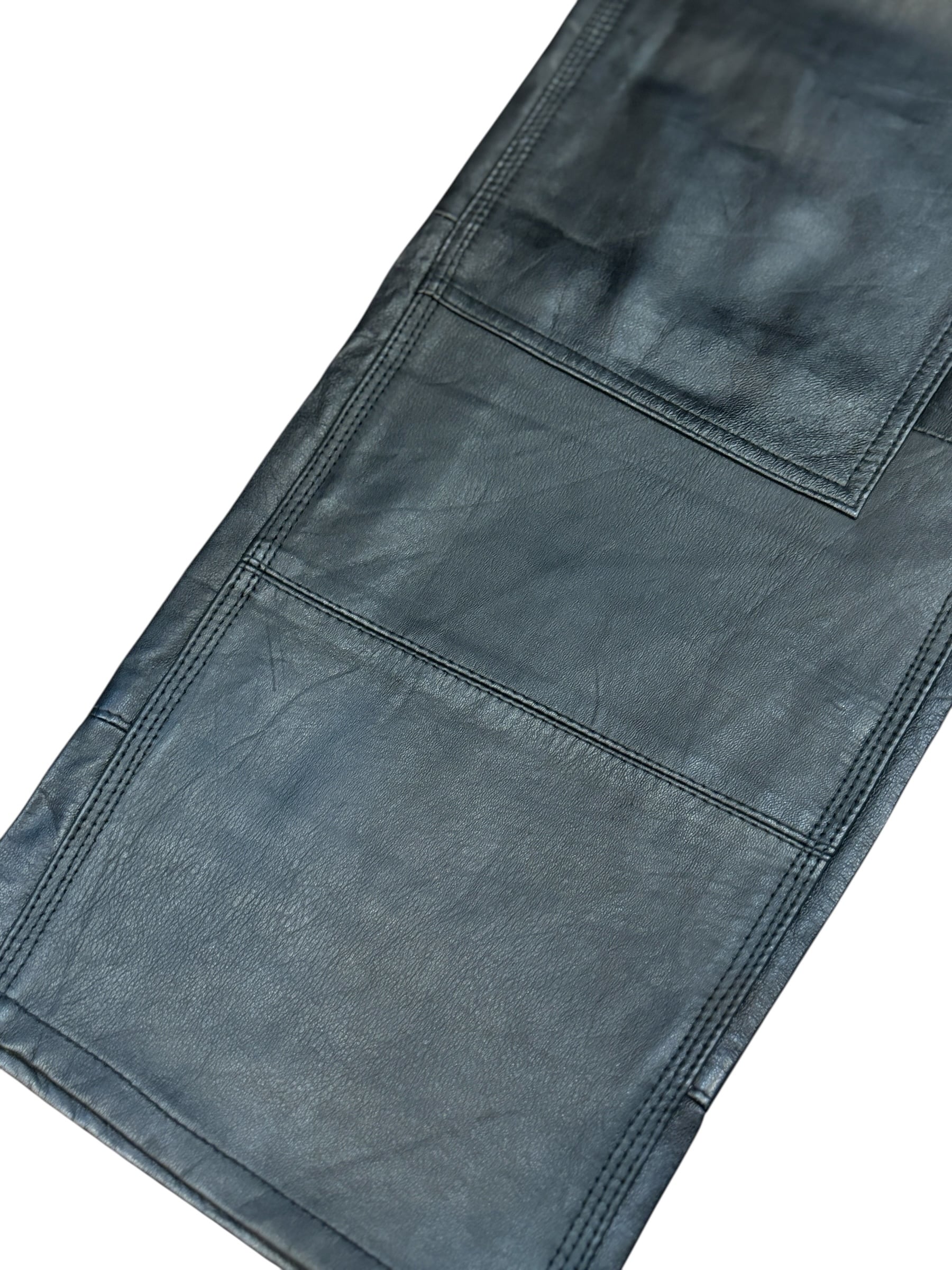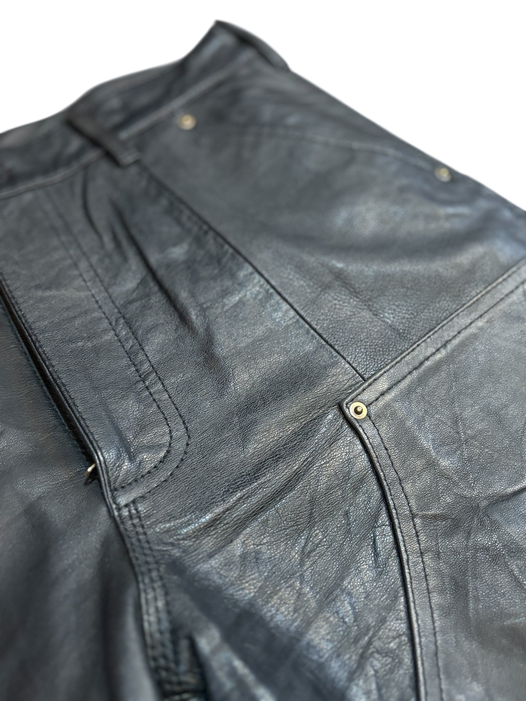レザージャケットやパンツを解体し再構築した贅沢なダブルニーレザーパンツです。
