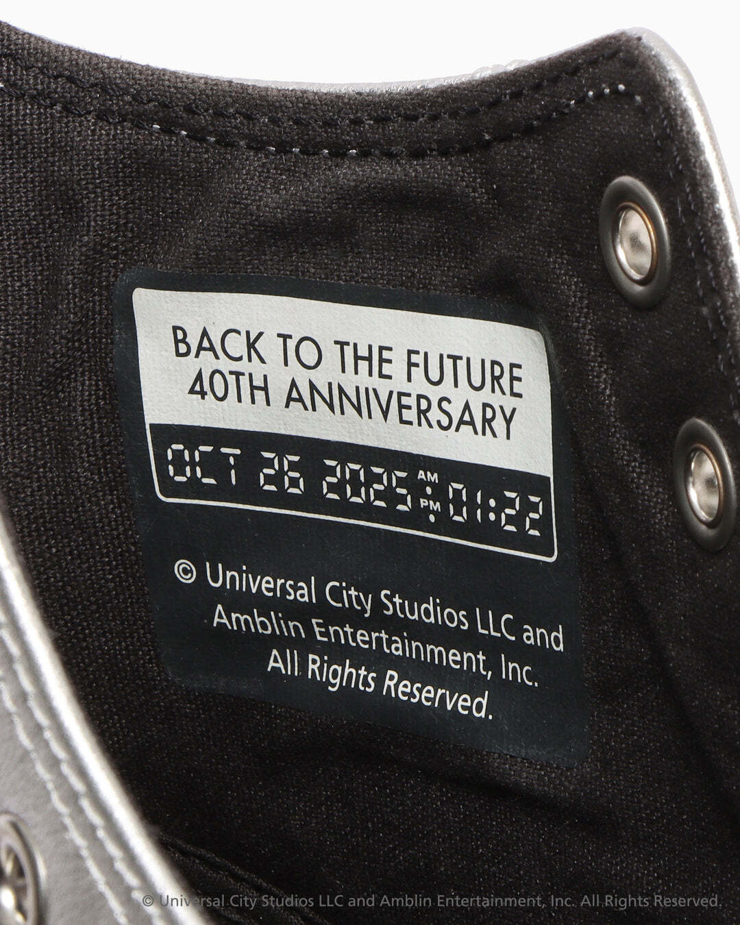 マーティが初めてタイムスリップした日から40年後の日付を表記した40周年限定のオリジナルロゴと、タイムサーキットの表示をライニングにプリント。