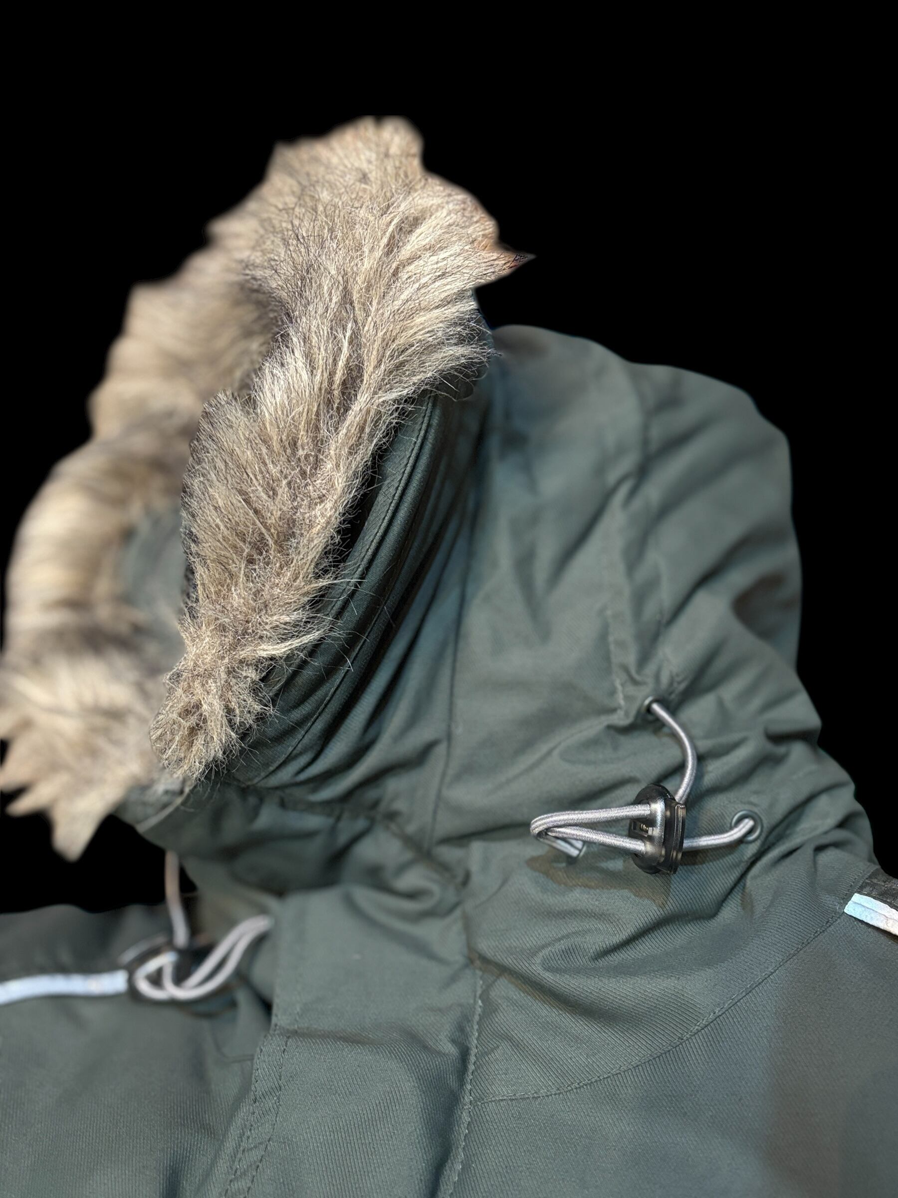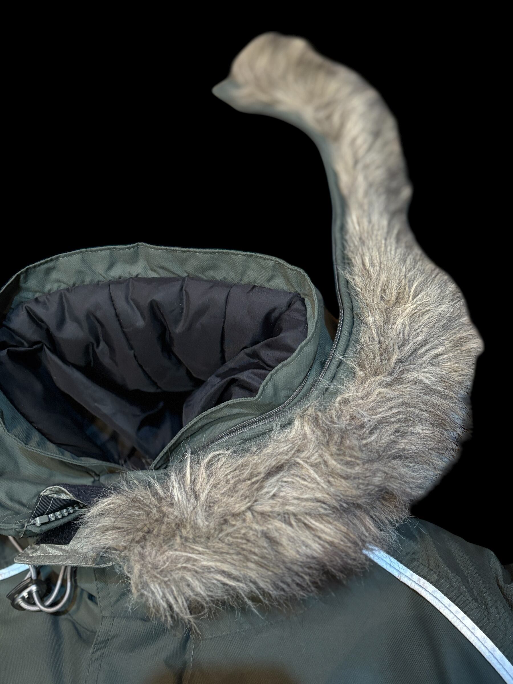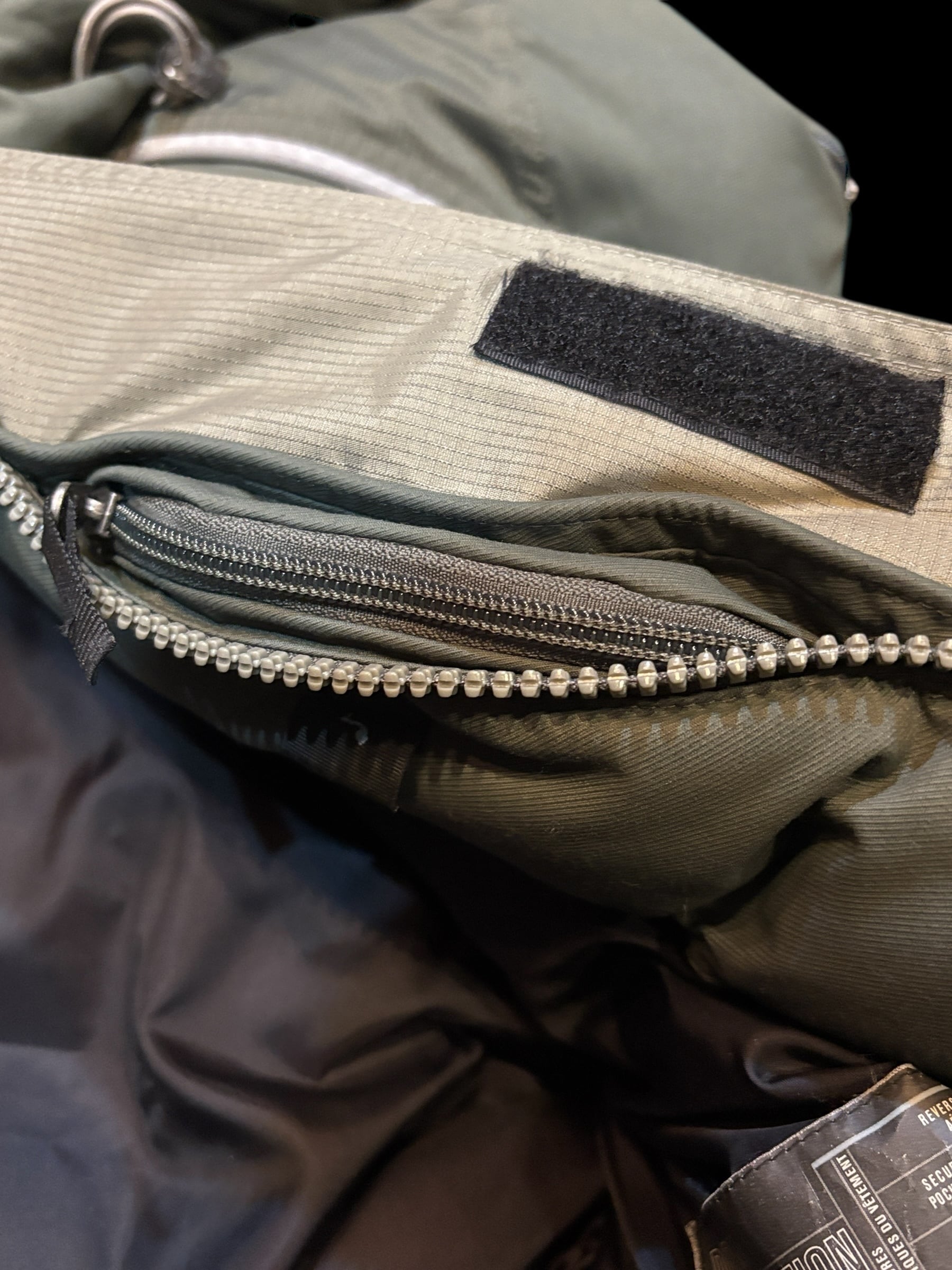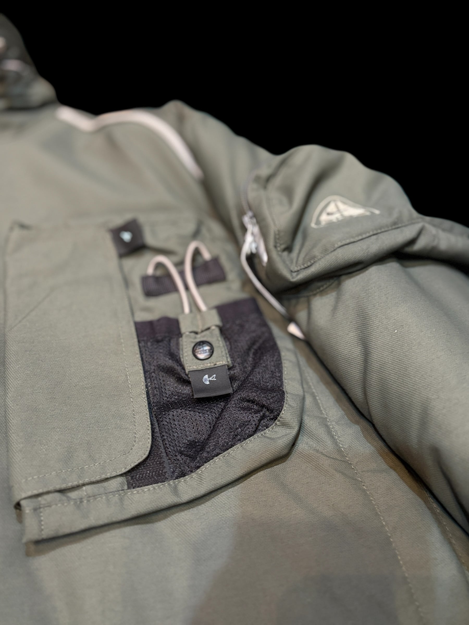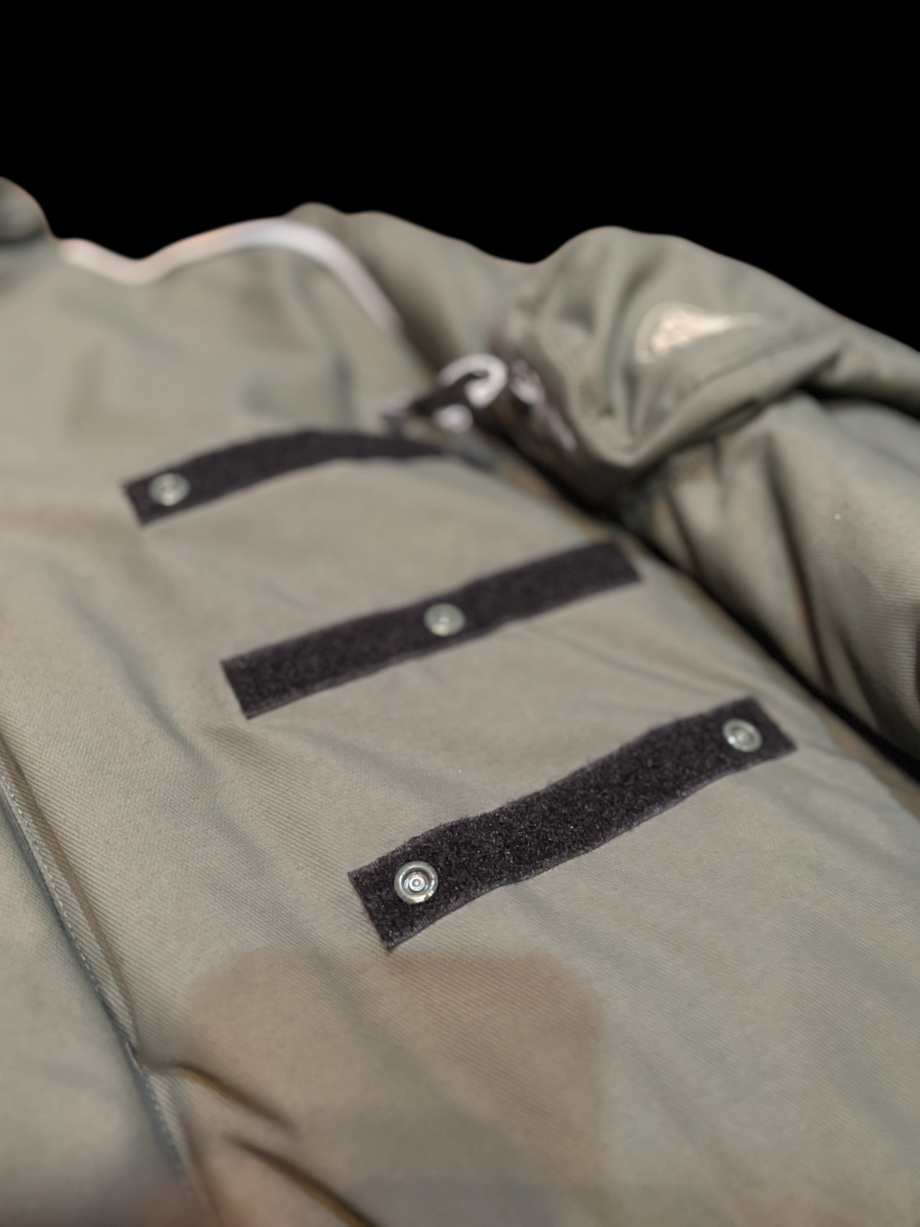 胸のポケット左はベルクロで取り外し可能。ファーもジップとスナップで取り外し可能です。