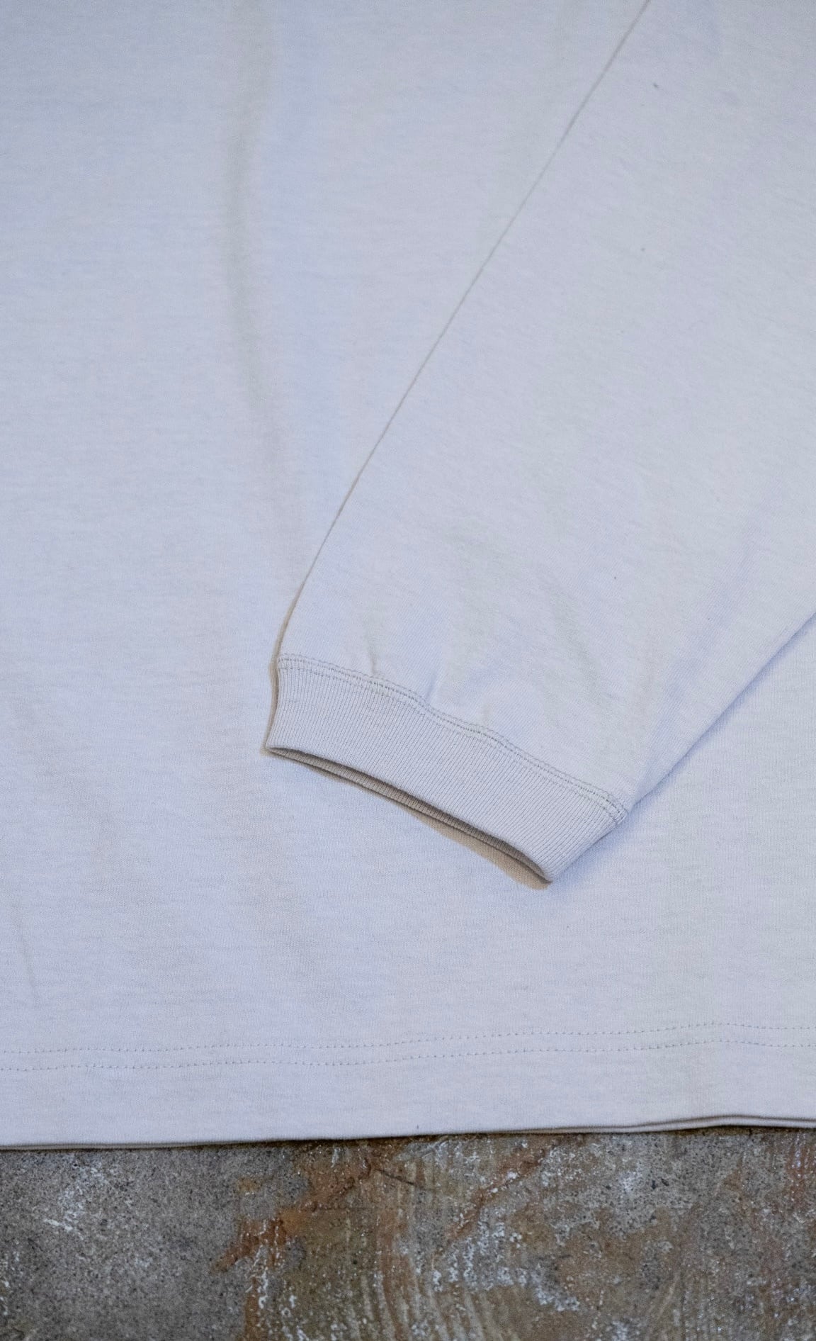 usedコットンを一度解きほぐし、再度紡績されたピュアリサイクルコットンを天竺編みで編み立てた生地になりまして、その為ナチュラルなムラや、ネップ感が生まれヴィンテージ感のある素材を使用。