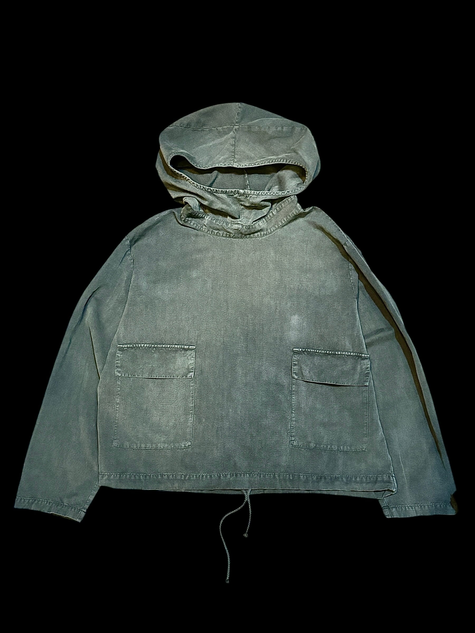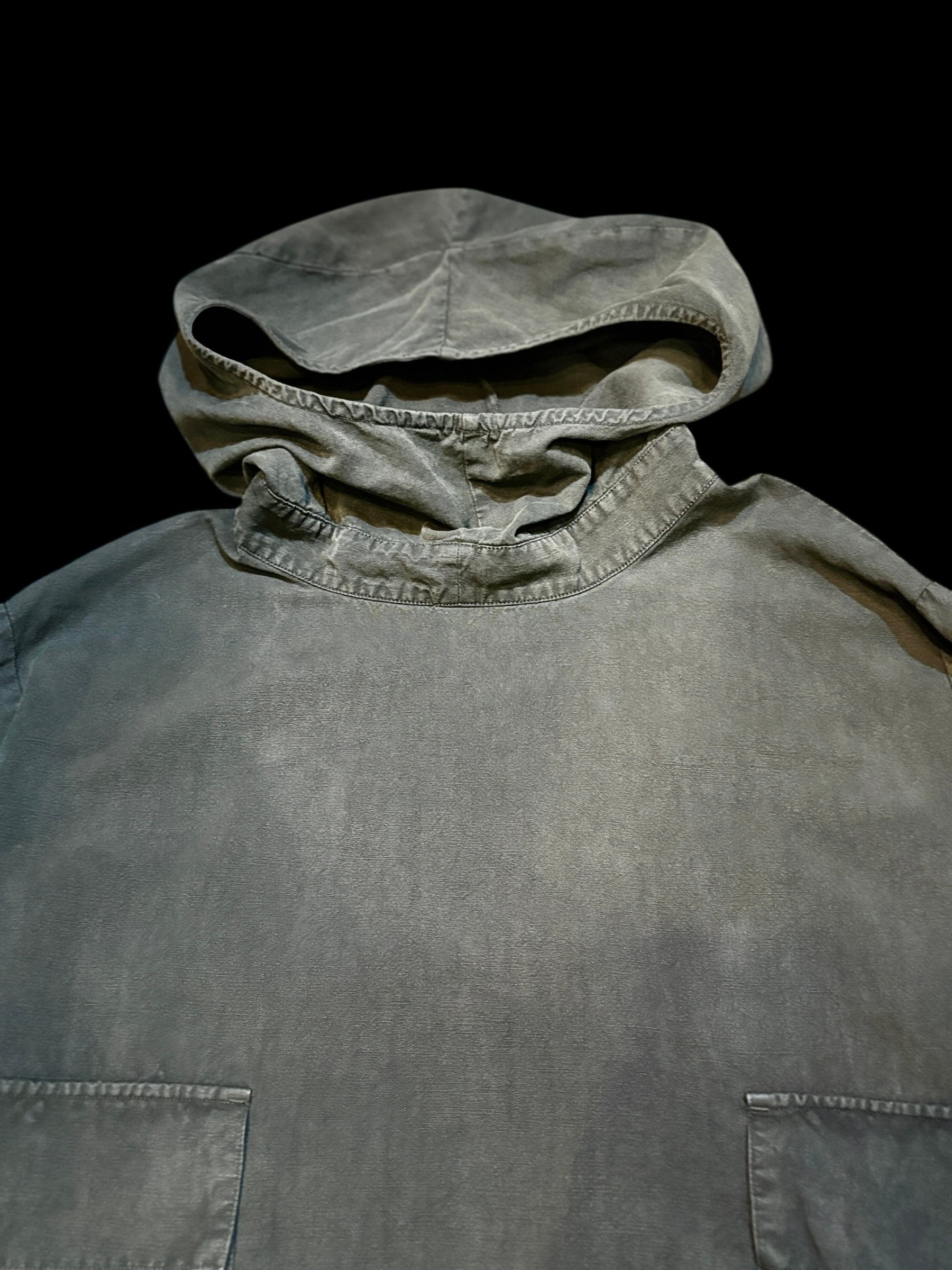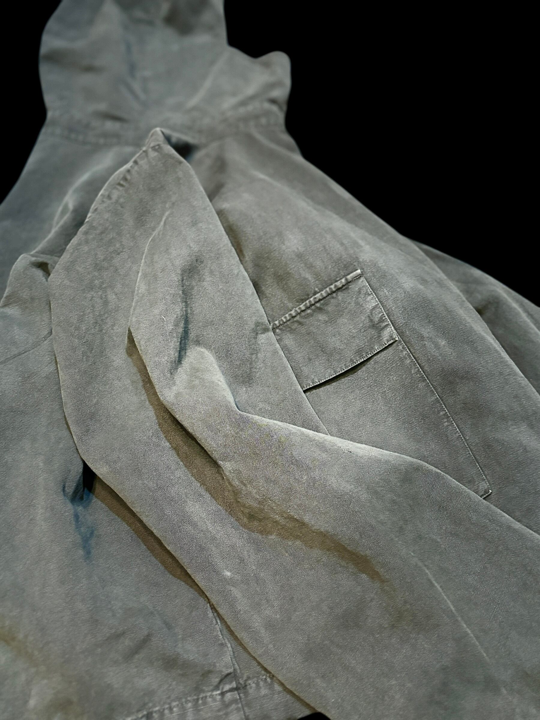 40年代のサルベージパーカーをモデルにし、フランスの100年以上前のリネン生地を集め縫製したアイテム。当時は座礁船の引き上げや救助の際に着用されていたスモックパーカーでミリタリーの中でも特殊なアイテムです。ガスマスクを着用できるようフードは大きめに作られており顎まで隠れる大きさがとてもかっこいいです。
