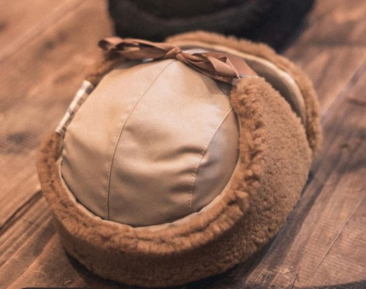 飛行帽。当時は完全に防寒用として作られていた飛行帽ですが、ブリムとシコロのボアがアクセントになりファッションとしても合わせられる帽子です。