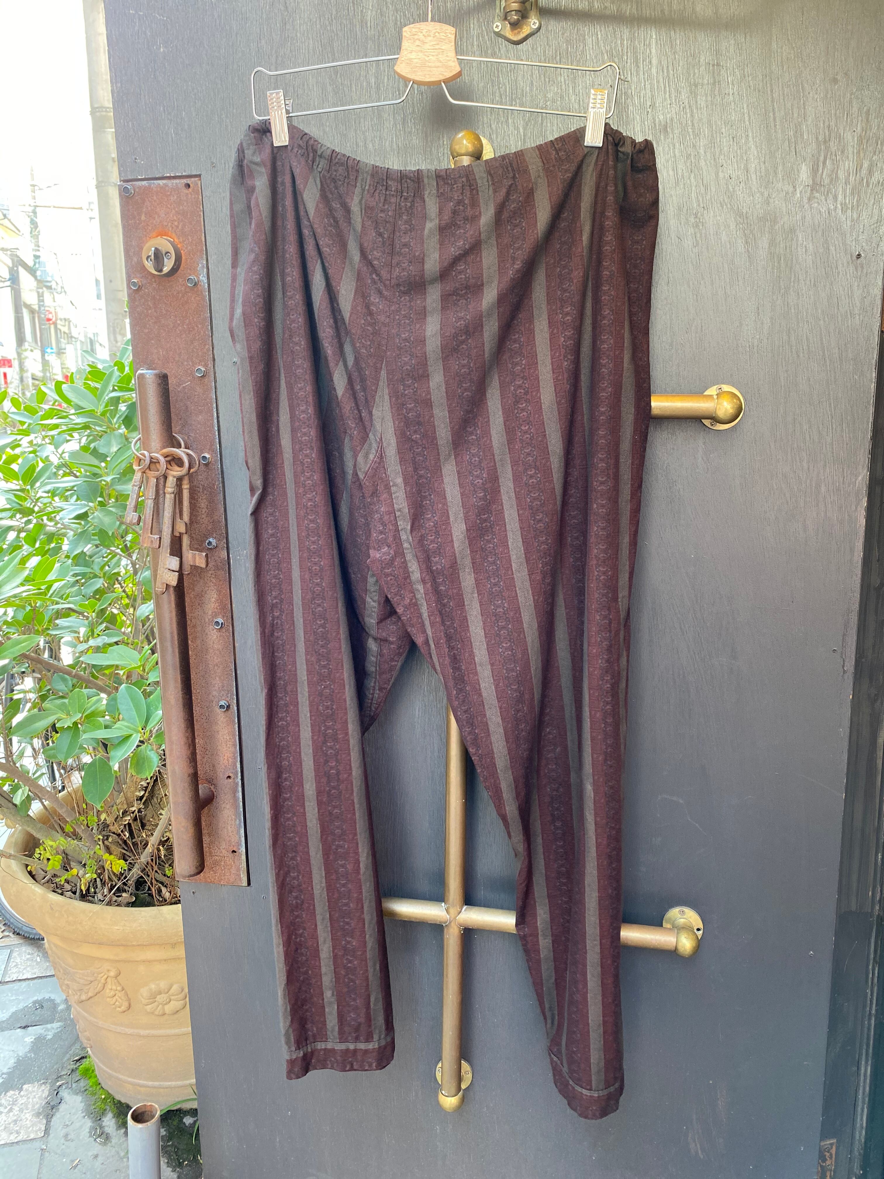 ウエスト部分は紐などは付いておらず調整不可となります。ゴムが伸びている為ゴムを入れ直せばより履きやすくなるかと思います。