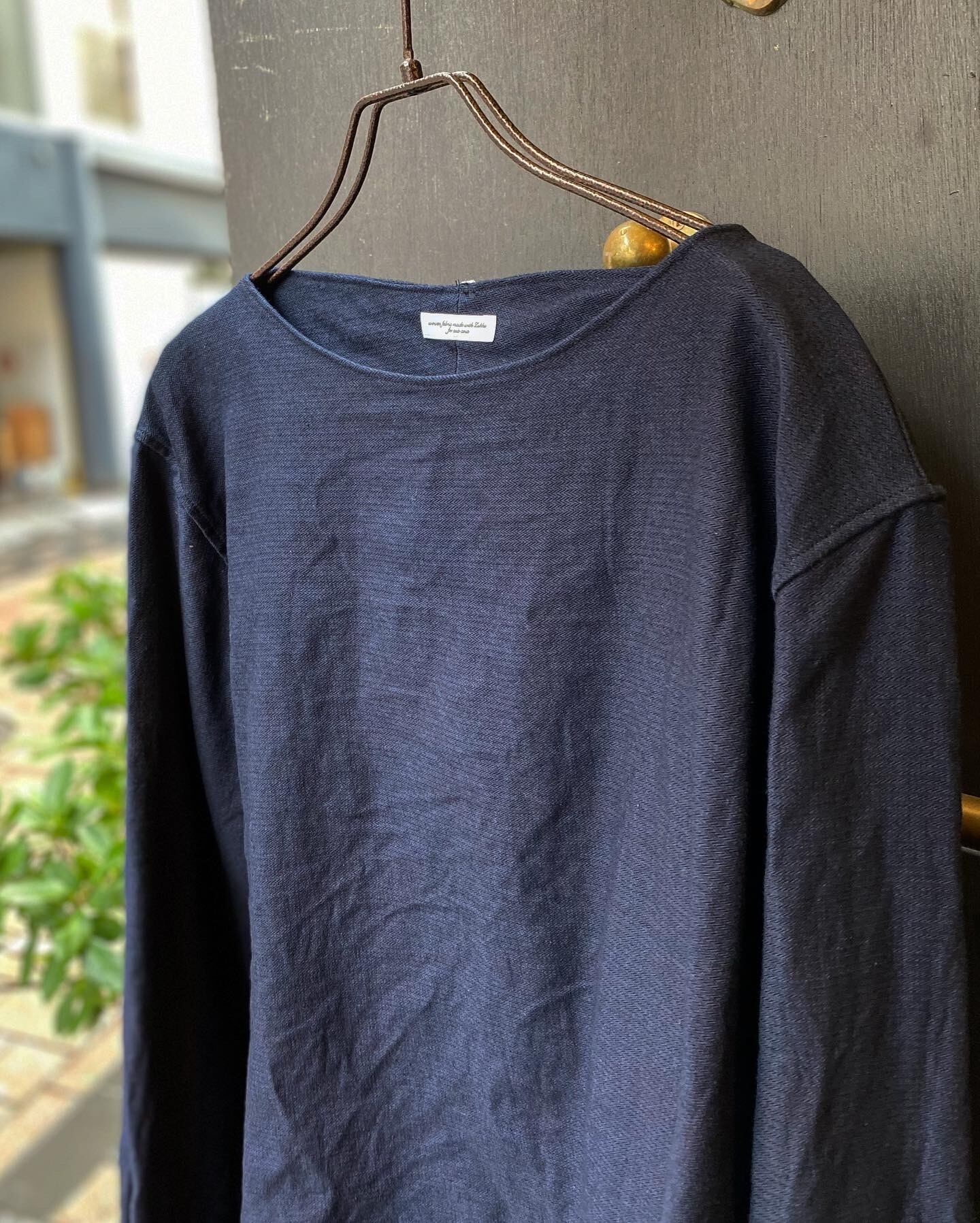 首元はカットソーのようなボートネックで袖口にはシャツのようにカフス付き。