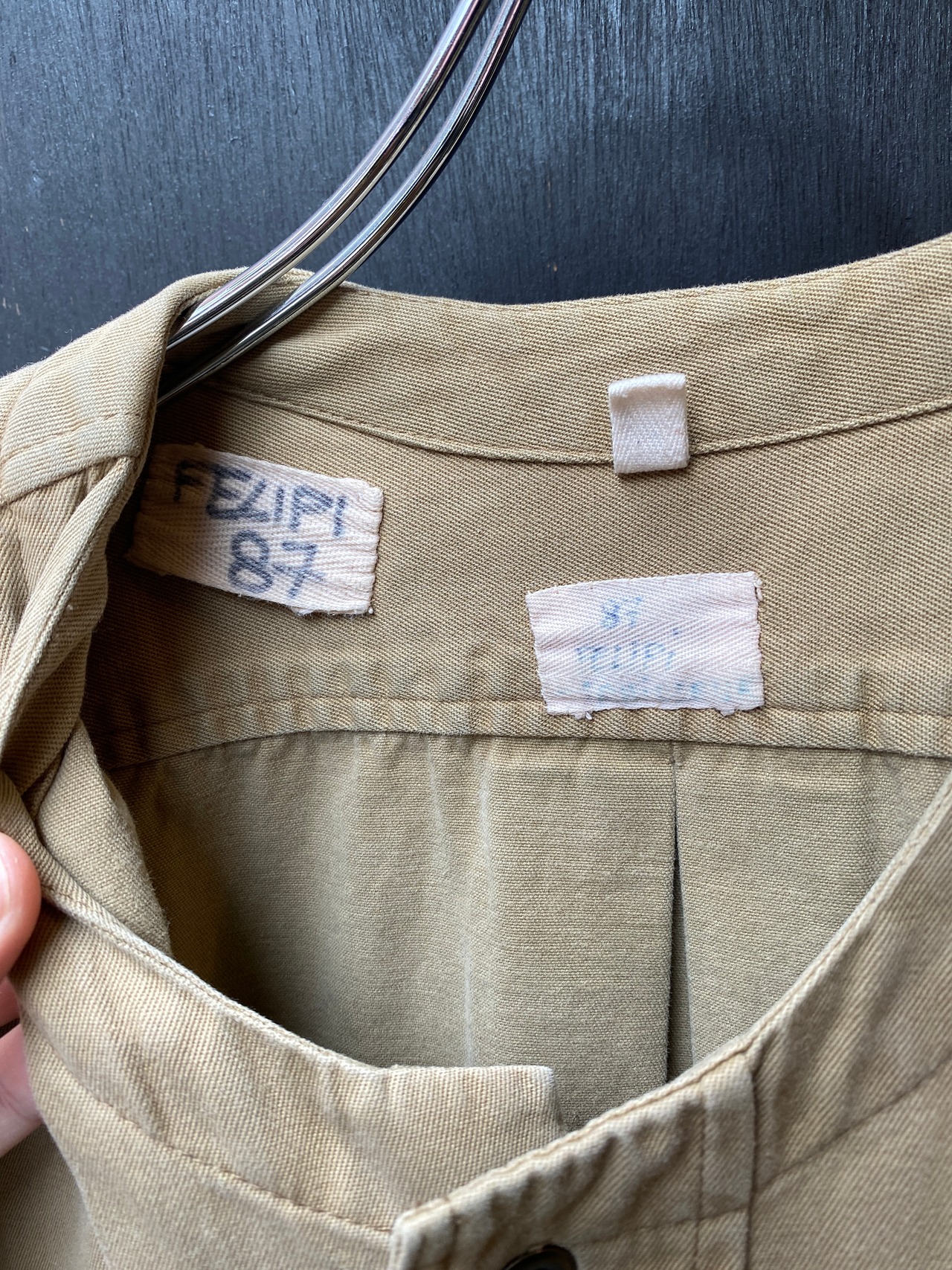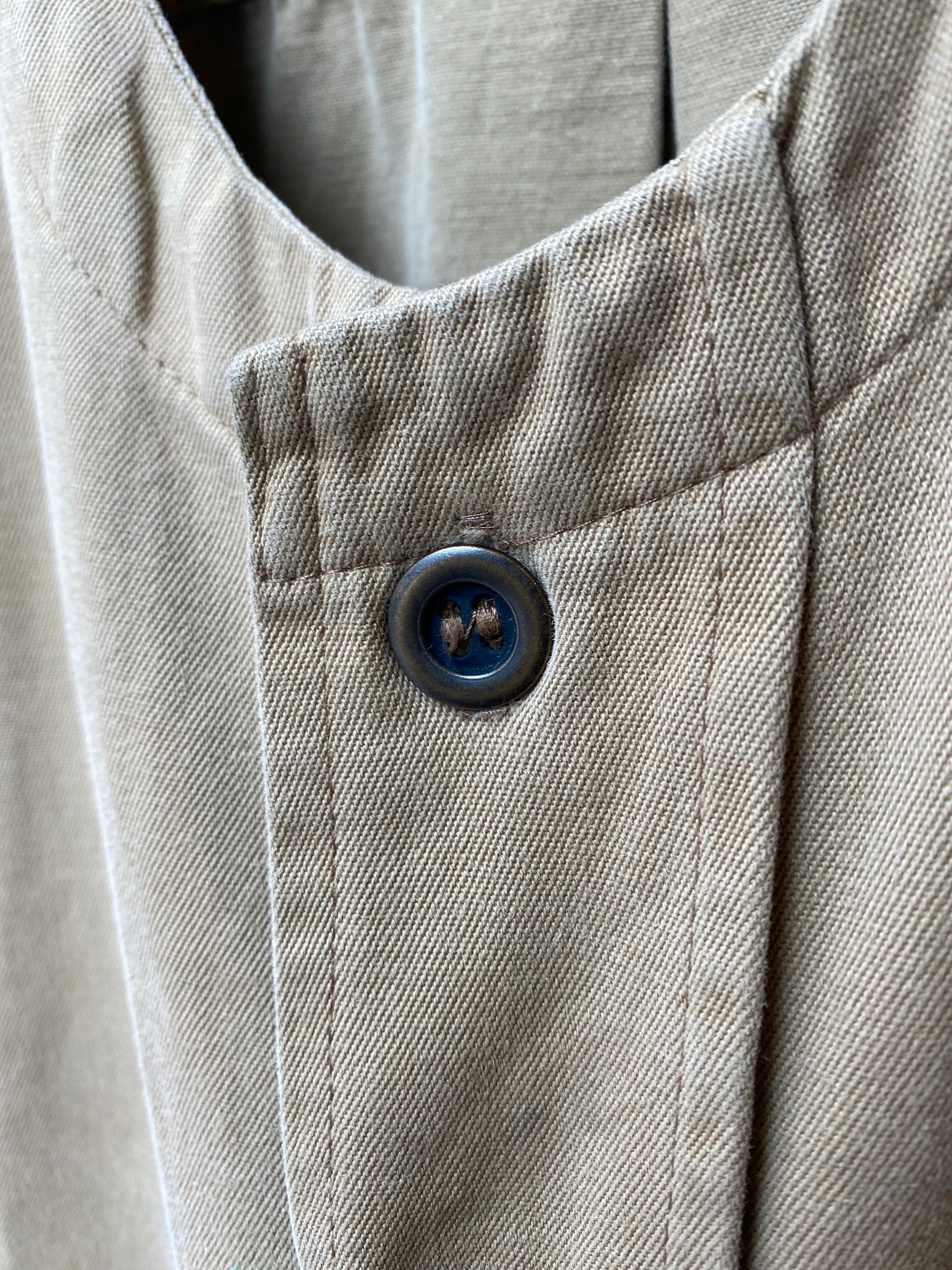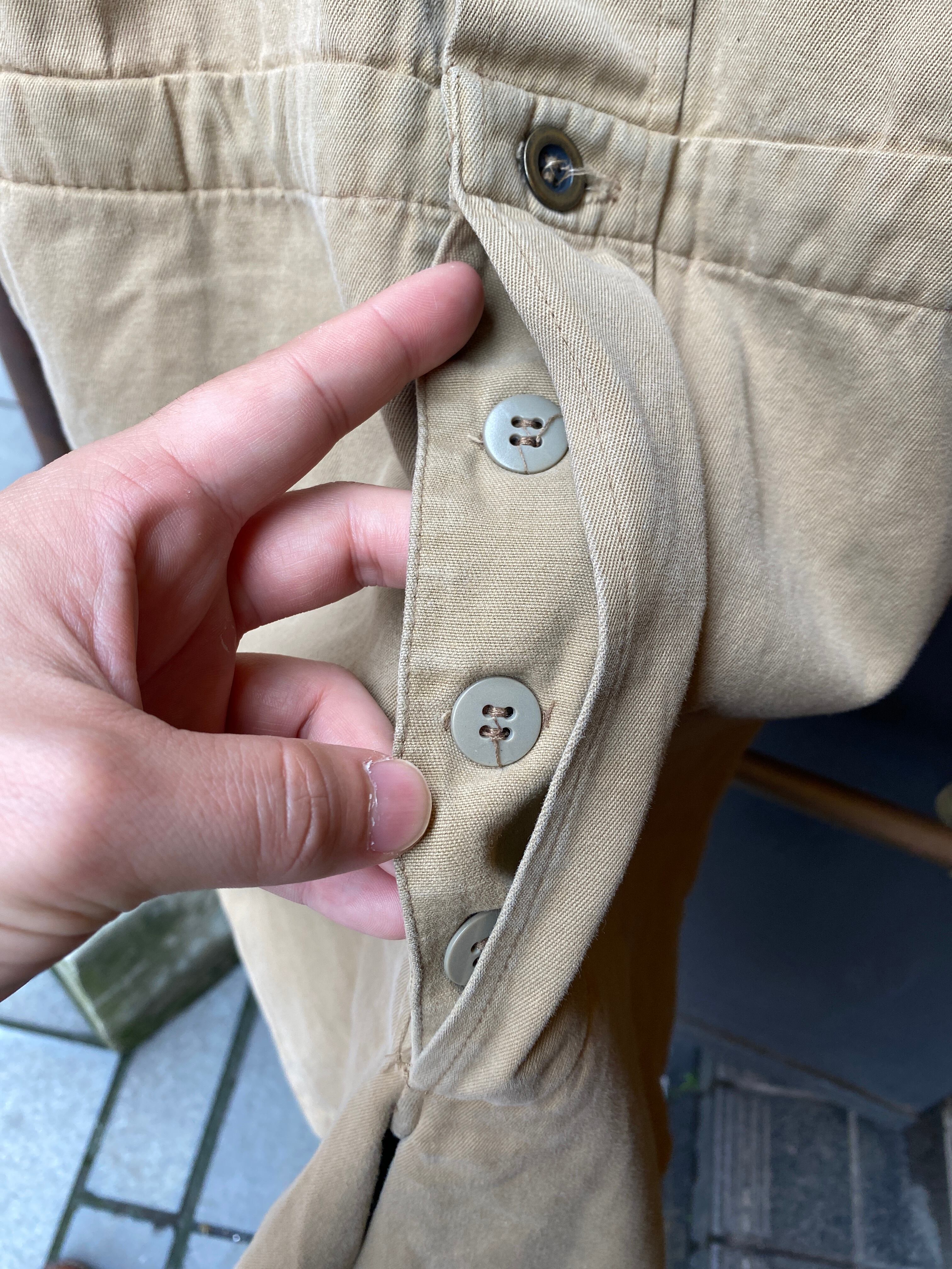 かなり珍しい半袖短パンのツナギ。コットンツイルのしっかりしたチノ系の素材、古いメタルボタン、針刺しシンチバックル、縦長の胸ポケットなど古き良き時代を感じさせるアイテムです。