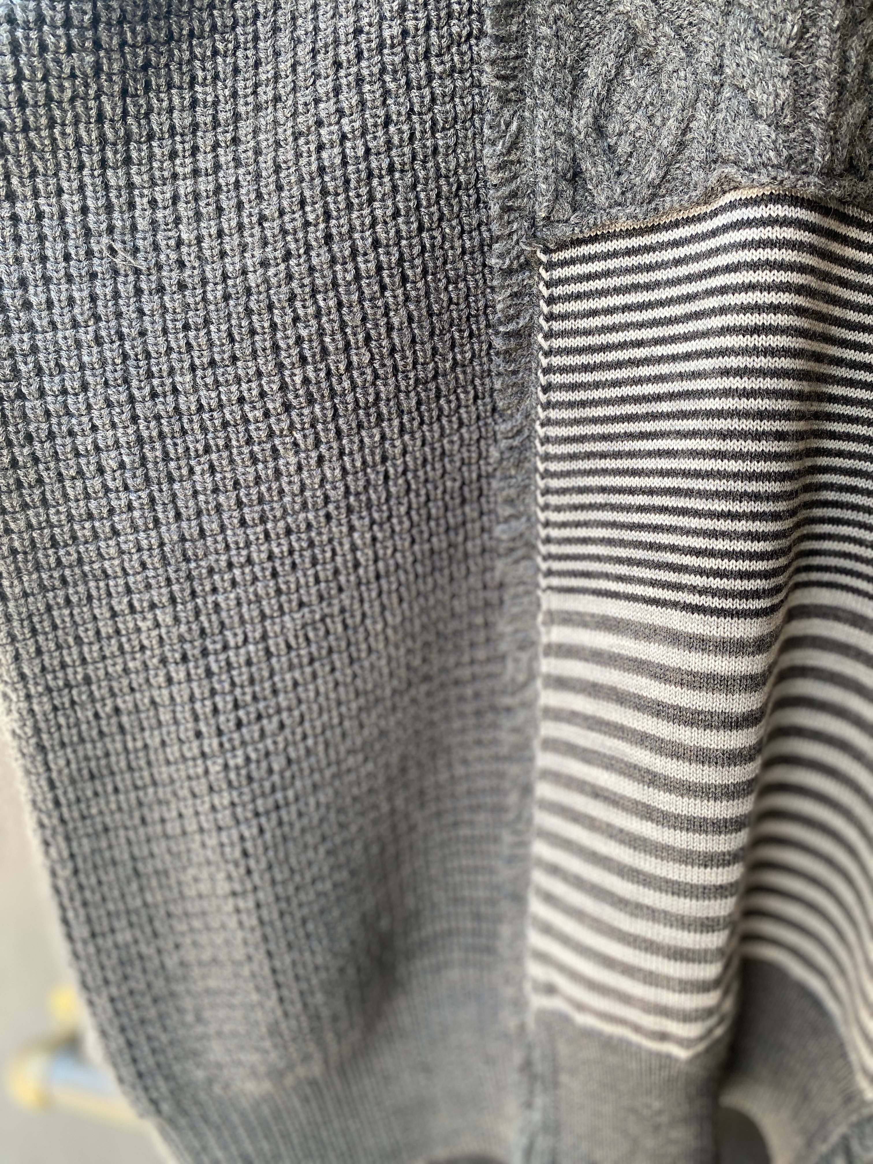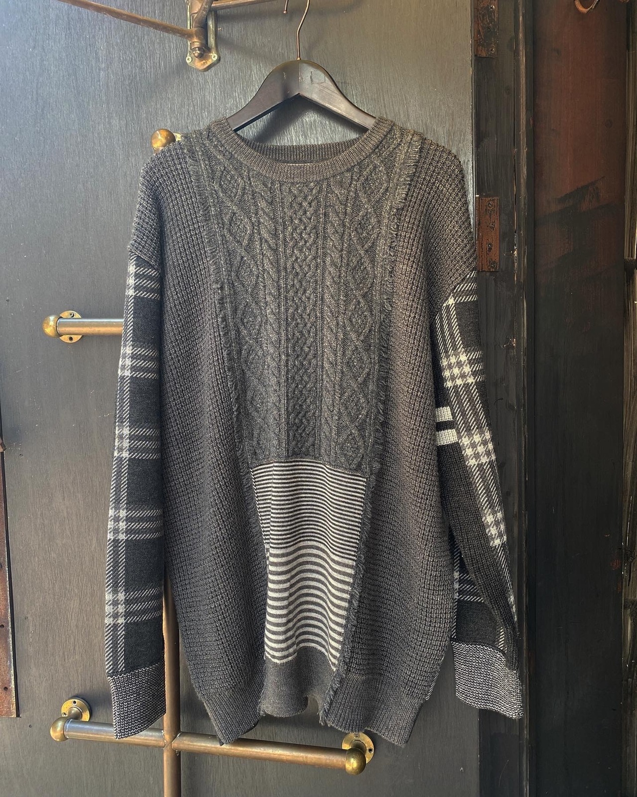 5パターンの柄、厚み、編み組織の違う編地を大胆に組み合わせたプルオーバーニット。