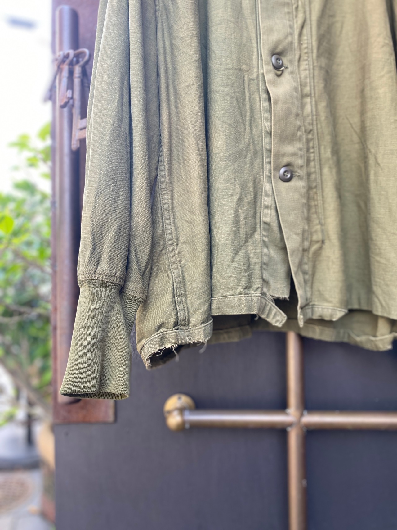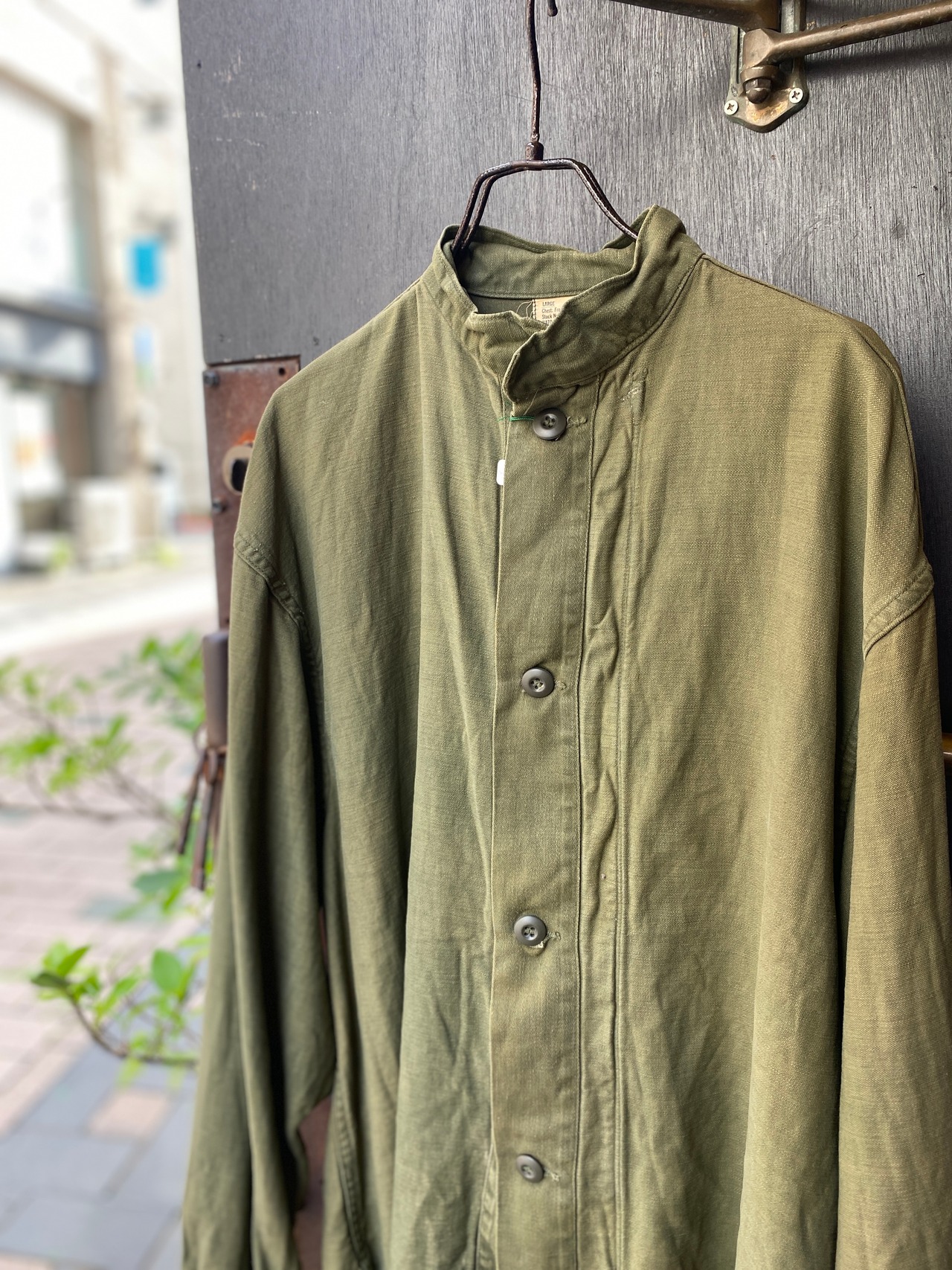 ファティーグシャツやベイカーパンツ同様にUSミリタリーらしいしっかりとハリのあるおそらくコットンサテン生地、1つのボタンに2つのボタンホールを通すガスフラップと呼ばれるフラップ付きの二重構造のフロント、しっかりと伸縮性のある袖先の長めのリブや裾の表面への折り返しのディティールもポイントです。