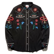 ウェスタンシャツのようなシルエットに、遊び心満載の刺繍を大胆にデザインとして施したアイテム。