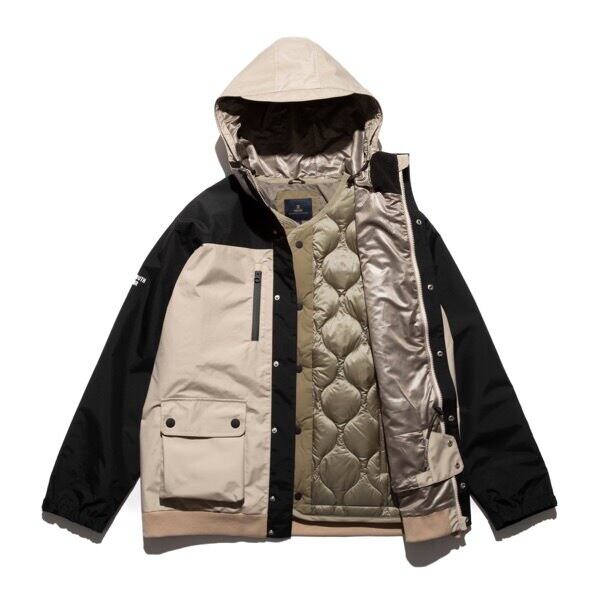 前立て裏側に配置されたスイッチにより5段階の温度調整が可能。前立て裏側にスイッチを配置することでアクセスがしやすく、且つSYSTEM稼働中のLED点灯が目立つことが無いように配慮されています。袖が切り離し可能なデタッチャブル仕様となっており中綿には95%ダウン/5%フェザーを使用、800フィルパワーという高いスペックを誇ります。秋から冬の入り口まではアウターとして、真冬にはインナーダウンとして大いに活躍します。