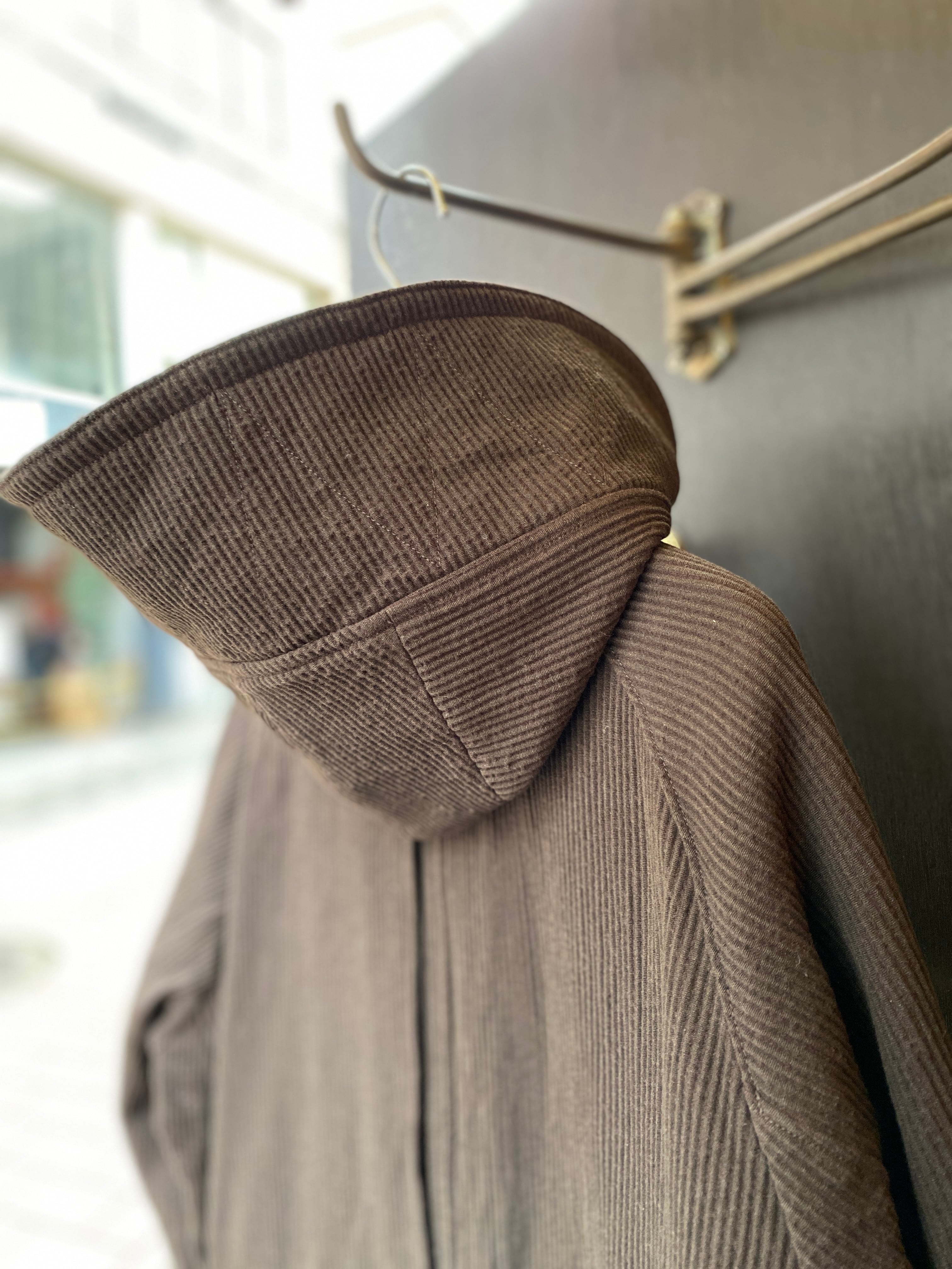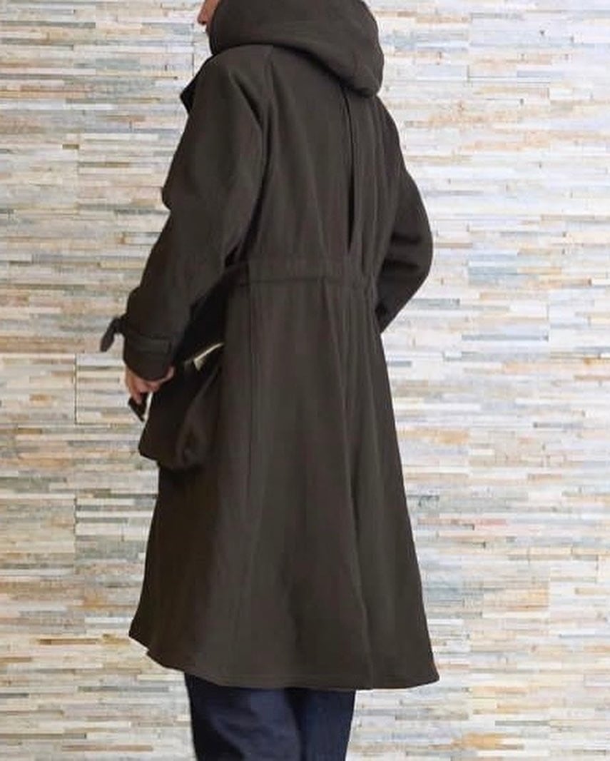 前のボタンを閉じると首元にボリュームが出る作りとなっており、さらにフードの大きさがあるので一般的なフーデッドコートとはまた違った雰囲気を出せます。